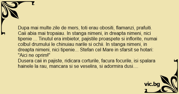 Dupa mai multe zile de mers, toti erau obositi, flamanzi, prafuiti. Caii abia mai tropaiau. In stanga nimeni, in dreapta nimeni, nici tipenie ... Tinutul era imbietor, pajistile proaspete si inflorite, numai colbul drumului le chinuiau narile si ochii. In stanga nimeni, in dreapta nimeni, nici tipenie... Stefan cel Mare in sfarsit se hotari: