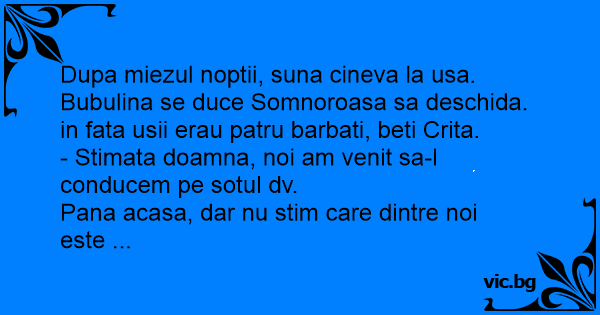 Dupa miezul noptii, suna cineva la usa. Bubulina se duce Somnoroasa sa deschida. in fata usii erau patru barbati, beti Crita.