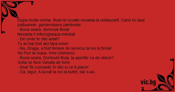 Dupa multa vreme, Bula isi scoate nevasta la restaurant. Cand Isi lasa paltoanele, garderobiera zambeste: