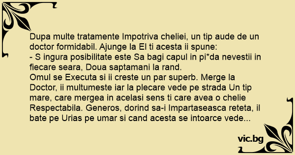 Omul se Executa si ii creste un par superb. Merge la Doctor, ii multumeste iar la plecare vede pe strada Un tip mare, care mergea in acelasi sens ti care avea o chelie Respectabila. Generos, dorind sa-i Impartaseasca reteta, il bate pe Urias pe umar si cand acesta se intoarce vede Ca individul are o barba imensa. La care din gura Nu-i iese altceva decat:
