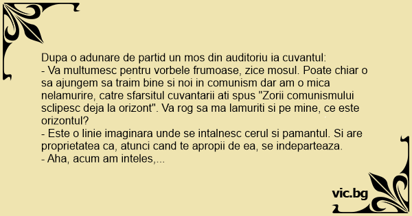 - Va multumesc pentru vorbele frumoase, zice mosul. Poate chiar o sa ajungem sa traim bine si noi in comunism dar am o mica nelamurire, catre sfarsitul cuvantarii ati spus "Zorii comunismului sclipesc deja la orizont". Va rog sa ma lamuriti si pe mine, ce este orizontul?