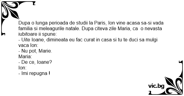 - Uite Ioane, dimineata eu fac curat in casa si tu te duci sa mulgi vаса Ion: