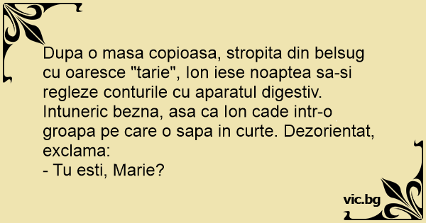 Dupa o masa copioasa, stropita din belsug cu oaresce "tarie", Ion iese noaptea sa-si regleze conturile cu aparatul digestiv.