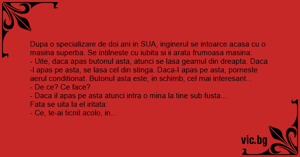 Dupa o specializare de doi ani in SUA, inginerul se intoarce acasa cu o masina superba. Se intilneste cu iubita si ii arata frumoasa masina: