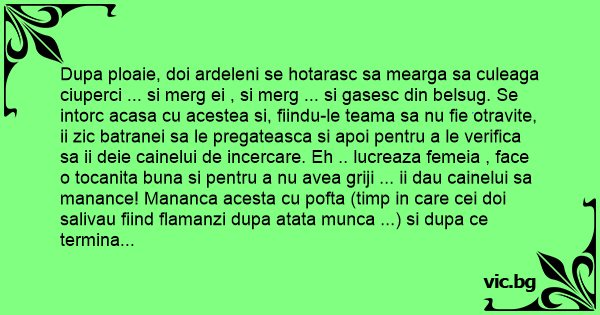 - Auzind acesta cei doi ardeleni incep sa borasca tot ce au mancat si sa isi scoata ultimele ramashite de ciuperci si ajung intr-un stadiu de disperare totala ... moment in care batrana completeaza :