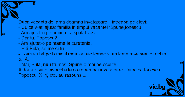 Dupa vacanta de iarna doamna invatatoare ii intreaba pe elevi: