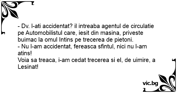 - Dv. l-ati accidentat? il intreaba agentul de circulatie pe Automobilistul care, iesit din masina, priveste buimac la omul Intins pe trecerea de pietoni.