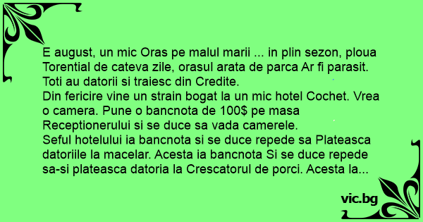 Seful hotelului ia bancnota si se duce repede sa Plateasca datoriile la macelar. Acesta ia bancnota Si se duce repede sa-si plateasca datoria la Crescatorul de porci. Acesta la randul lui se Grabeste sa-si plateasca datoriile la cel ce-i Livreaza furaje pentru porci. Cel cu furajele Insfaca bancnota si alearga la prostituata pe Care nu o mai platise demult. In timpurile astea de criza Pana si ea ofera servicii pe datorie! Prostituata ia Bancnota in mana si se grabeste spre hotel, Unde fusese cu clientii ultimele dati si unde Ramasese datoare.