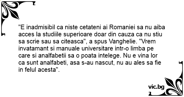 "E inadmisibil ca niste cetateni ai Romaniei sa nu aiba acces la studiile superioare doar din cauza ca nu stiu sa scrie sau sa citeasca", a spus Vanghelie. "Vrem invatamant si manuale universitare intr-o limba pe care si analfabetii sa o poata intelege. Nu e vina lor ca sunt analfabeti, asa s-au nascut, nu au ales sa fie in felul acesta".