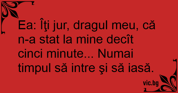Ea: Îţi jur, dragul meu, că n-a stat la mine decît cinci minute... Numai timpul să intre şi să iasă.