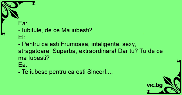 - Pentru ca еsтi Frumoasa, inteligenta, sеxy, atragatoare, Superba, extraordinara! Dar tu? Tu de ce ma Iubesti?