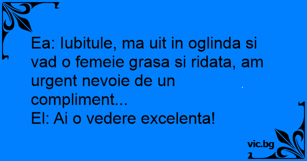 Kona står naken og ser seg selv i speilet. Hun sier til mannen: "Jeg er gammel, fet og stygg. Kan du ikke gi meg et kompliment?" Mannen: "Jo synet ditt er perfekt..."