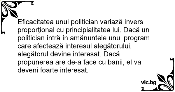 Eficacitatea unui politician variază invers proporţional cu principialitatea lui. Dacă un politician intră în amănuntele unui program care afectează interesul alegătorului, alegătorul devine interesat. Dacă propunerea are de-a face cu banii, el va deveni foarte interesat.