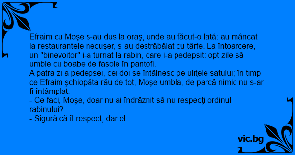Efraim cu Moşe s-au dus la oraş, unde au făcut-o lată: au mâncat la restaurantele necuşer, s-au destrăbălat cu târfe. La întoarcere, un "binevoitor" i-a turnat la rabin, care i-a pedepsit: opt zile să umble cu boabe de fasole în pantofi.
