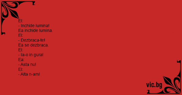 El: - Inchide lumina! Ea inchide lumina. El: - Dezbraca-te! Ea se dezbraca. El: - Ia-o in gura! Ea: - Asta nu! El: - Alta n-am!