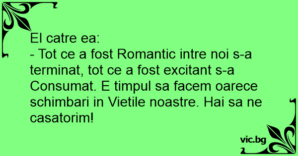 - Tot ce a fost Romantic intre noi s-a terminat, tot ce a fost excitant s-a Consumat. E timpul sa facem oarece schimbari in Vietile noastre. Hai sa ne casatorim!