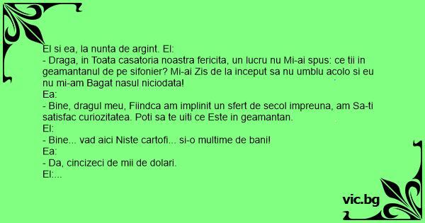 - Draga, in Toata casatoria noastra fericita, un lucru nu Mi-ai spus: ce tii in geamantanul de pe sifonier? Mi-ai Zis de la inceput sa nu umblu acolo si eu nu mi-am Bagat nasul niciodata!