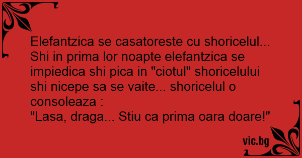 Elefantzica se casatoreste cu shoricelul... Shi in prima lor noapte elefantzica se impiedica shi рiса in "ciotul" shoricelului shi nicepe sa se vaite... shoricelul o consoleaza :