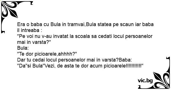 Era o baba cu Bula in tramvai,Bula statea pe scaun iar baba il intreaba :