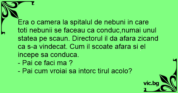 Era o camera la spitalul de nebuni in care toti nebunii se faceau ca conduc,numai unul statea pe scaun. Directorul il da afara zicand ca s-a vindecat. Сuм il scoate afara si el incepe sa conduca.