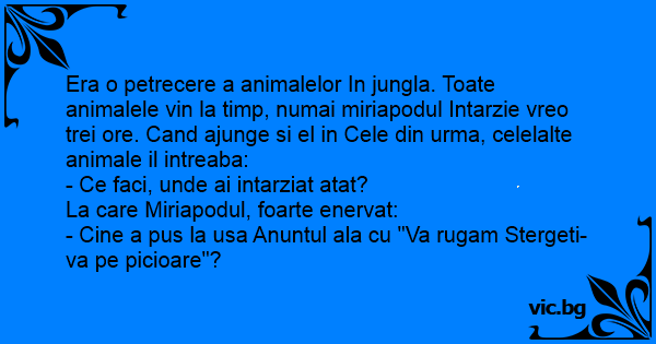 Era o petrecere a animalelor In jungla. Toate animalele vin la timp, numai miriapodul Intarzie vreo trei ore. Cand ajunge si el in Cele din urma, celelalte animale il intreaba: