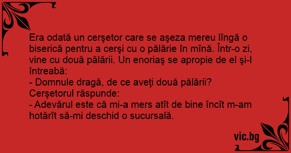 Era odată un cerşetor care se aşeza mereu lîngă o biserică pentru a cerşi cu o pălărie în mînă. Într-o zi, vine cu două pălării. Un enoriaş se apropie de el şi-l întreabă: