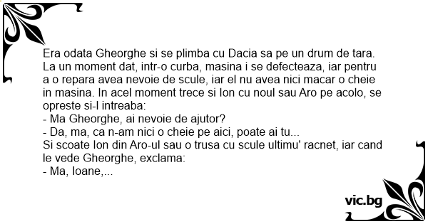 Era odata Gheorghe si se plimba cu Dacia sa pe un drum de tara. La un moment dat, intr-o curba, masina i se defecteaza, iar pentru a o repara avea nevoie de scule, iar el nu avea nici macar o cheie in masina. In acel moment trece si Ion cu noul sau Aro pe acolo, se opreste si-l intreaba: