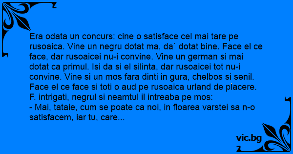 Era odata un concurs: cine o satisface cel mai tare pe rusoaica. Vine un negru dotat ma, da` dotat bine. Face el ce face, dar rusoaicei nu-i convine. Vine un german si mai dotat ca primul. Isi da si el silinta, dar rusoaicei tot nu-i convine. Vine si un mos fara dinti in gura, chelbos si senil. Face el ce face si toti o aud pe rusoaica urland de placere. F. intrigati, negrul si neamtul il intreaba pe mos: