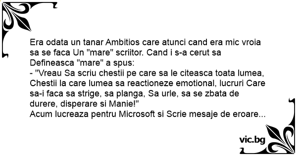Era odata un tanar Ambitios care atunci cand era mic vroia sa se faca Un "mare" scriitor. Cand i s-a cerut sa Defineasca "mare" a spus: