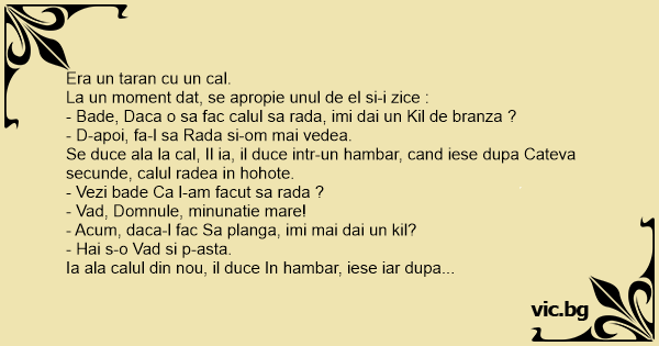 - Bade, Daca o sa fac calul sa rada, imi dai un Kil de branza ?