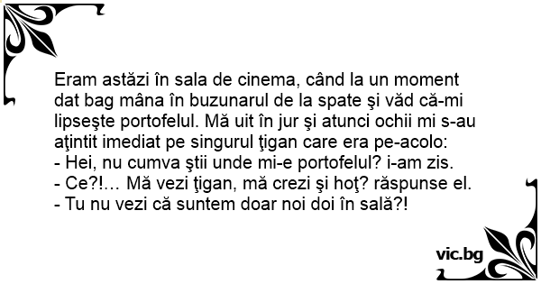 Eram astăzi în sala de cinema, când la un moment dat bag mâna în buzunarul de la spate şi văd că-mi lipseşte portofelul. Mă uit în jur şi atunci ochii mi s-au aţintit imediat pe singurul ţigan care era pe-acolo: