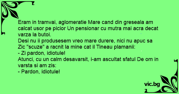 Eram in tramvai, aglomeratie Mare cand din greseala am calcat usor pe picior Un pensionar cu mutra mai acra decat varza la butoi.