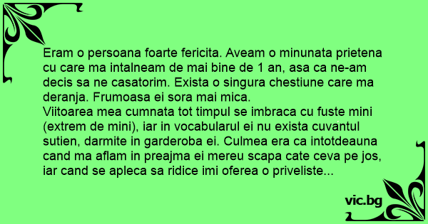 Viitoarea mea cumnata tot timpul se imbraca cu fuste mini (extrem de mini), iar in vocabularul ei nu exista cuvantul sutien, darmite in garderoba ei. Culmea era ca intotdeauna cand ma aflam in preajma ei mereu scapa cate ceva pe jos, iar cand se apleca sa ridice imi oferea o priveliste mai mult decat frumoasa. Era clar. O facea in mod deliberat. Pentru ca asemenea scene nu se intamplau daca era si altcineva de fata.