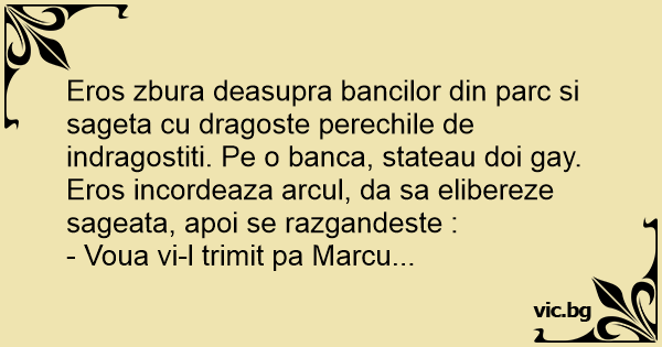 Eros zbura deasupra bancilor din parc si sageta cu dragoste perechile de indragostiti. Pe o banca, stateau doi gаy. Eros incordeaza arcul, da sa elibereze sageata, apoi se razgandeste :