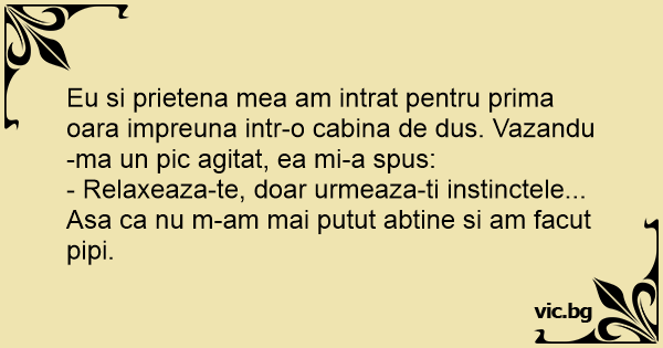 Eu si prietena mea am intrat pentru prima oara impreuna intr-o cabina de dus. Vazandu-ma un pic agitat, ea mi-a spus: