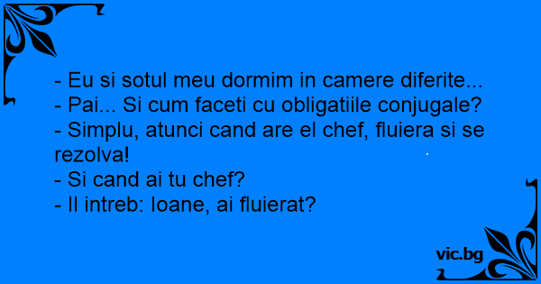 - Hogyan lehet így házaséletet élni, hogy külön hálószobátok van? - kérdi döbbenten a fiatalasszonyt a barátnője. - Egyszerű. A férjem füttyent egyet, ha kedve szottyan rá. - És ha neked van...