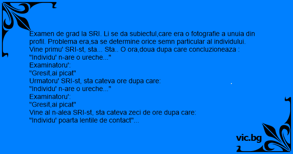 Examen de grad la SRI. Li se da subiectul,care era o fotografie a unuia din profil. Problema era,sa se determine orice semn particular al individului.