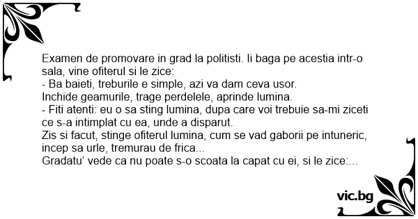 Examen de promovare in grad la politisti. Ii baga pe acestia intr-o sala, vine ofiterul si le zice: