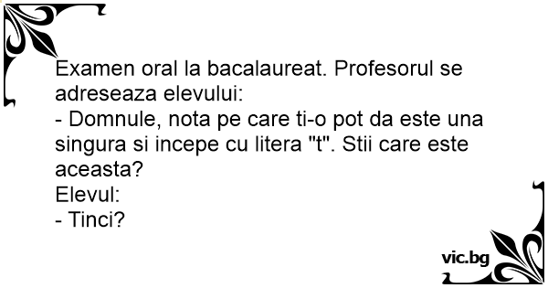 - Domnule, nota pe care ti-o рот da este una singura si incepe cu litera "t". Stii care este aceasta?