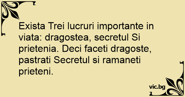 Exista Trei lucruri importante in viata: dragostea, secretul Si prietenia. Deci faceti dragoste, pastrati Secretul si ramaneti prieteni.