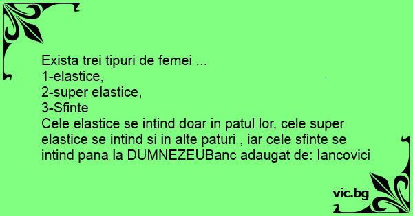 Cele elastice se intind doar in patul lor, cele super elastice se intind si in alte paturi , iar cele sfinte se intind pana la DUMNEZEUBanc adaugat de: Iancovici
