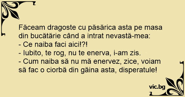 - Сuм naiba să nu mă enervez, zice, voiam să fac o ciorbă din găina asta, disperatule!