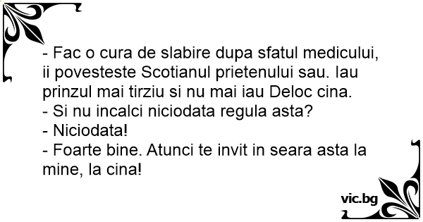 - Fac o cura de slabire dupa sfatul medicului, ii povesteste Scotianul prietenului sau. Iau prinzul mai tirziu si nu mai iau Deloc cina.