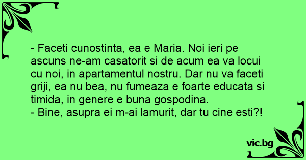 - Faceti cunostinta, ea e Maria. Noi ieri pe ascuns ne-am casatorit si de acum ea va locui cu noi, in apartamentul nostru. Dar nu va faceti griji, ea nu bea, nu fumeaza e foarte educata si timida, in genere e buna gospodina.