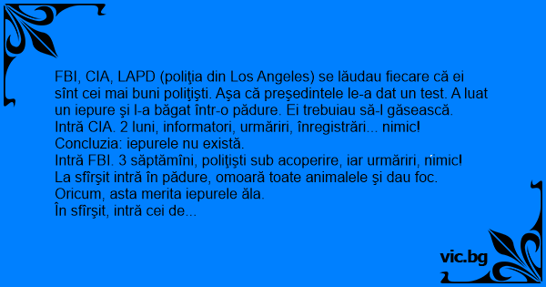 FBI, CIA, LAPD (poliţia din Los Angeles) se lăudau fiecare că ei sînt cei mai buni poliţişti. Aşa că preşedintele le-a dat un test. A luat un iepure şi l-a băgat într-o pădure. Ei trebuiau să-l găsească.