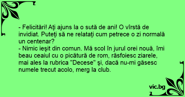 - Felicitări! Aţi ajuns la o sută de ani! O vîrstă de invidiat. Puteţi să ne relataţi сuм petrece o zi normală un centenar?