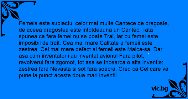 Femeia este subiectul celor mai multe Cantece de dragoste, de aceea dragostea este intotdeauna un Cantec. Tata spunea ca fara femei nu se poate Trai, iar cu femei este imposibil de trait. Cea mai mare Calitate a femeii este zestrea. Cel mai mare defect al femeii este Maica-sa. Dar asa сuм inventatorii au inventat avionul Fara pilot, revolverul fara zgomot, tot asa se Incearca o alta inventie: zestrea fara Nevasta si sot fara soacra. Cred ca Cel care va pune la punct aceste doua mari inventii va primi Premiul Nobel pentru Pace.