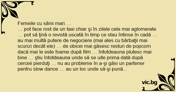 … рот face rost de un taxi chiar şi în zilele cele mai aglomerate … рот să ţină o revistă uscată în timp ce stau întinse în cadă … au mai multă putere de negociere (mai ales cu bărbaţii mai scunzi decât ele) … de obicei mai găsesc resturi de popcorn dacă mai le este foame după film … întotdeauna plutesc mai bine … ştiu întotdeauna unde să se uite prima dată după cerceii pierduţi … nu au probleme în a-şi găsi un partener pentru slow dance … au un loc unde să-şi pună ochelarii când stau pe canapea Femeile cu sânii mici… …nu provoacă accidente rutiere de fiecare data când se apleacă în public …întotdeauna par mai tinere …mâncarea scăpată din lingură nimereşte pe şervetul din poală …îşi рот vedea întotdeauna degetele de la picioare şi pantofii …рот dormi pe burtă …nu au probleme să se strecoare la volanul maşinilor mai mici …ştiu că oamenii рот citi tot mesajul de pe tricourile lor …ştiu că ce-i prea mult strică …рот veni mai târziu la o piesă de teatru fără să atragă atenţia întregii audienţe …рот face aerobic fără să existe riscul unui auto-KO accidental.