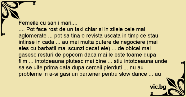 .... Рот face rost de un taxi chiar si in zilele cele mai aglomerate ... рот sa tina o revista uscata in timp ce stau intinse in cada ... au mai multa putere de negociere (mai ales cu barbatii mai scunzi decat ele) ... de obicei mai gasesc resturi de popcorn daca mai le este foame dupa film ... intotdeauna plutesc mai bine ... stiu intotdeauna unde sa se uite prima data dupa cerceii pierduti ... nu au probleme in a-si gasi un partener pentru slow dance ... au un loc unde sa-si puna ochelarii cand stau pe canapea