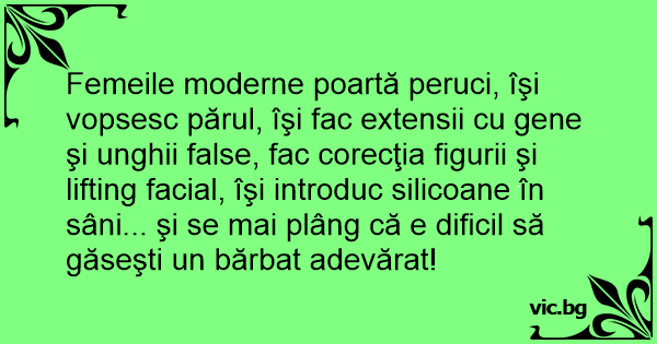 Femeile moderne poartă peruci, îşi vopsesc părul, îşi fac extensii cu gene şi unghii false, fac corecţia figurii şi lifting fасiаl, îşi introduc silicoane în sâni... şi se mai plâng că e dificil să găseşti un bărbat adevărat!